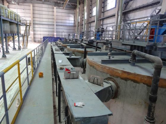 5.4 ExtractionThe copper extraction process mostly includes sections of agitation leaching, thickening, copper extraction, CCD scrubbing and cobalt precipitation and recovery. The copper-bearing solution after leaching will go through copper extraction and purification and then electrowinning to obtain cathode copper. Copper extractors designed by ENFI for projects of Shanxi Yangquan, CDM and Mabende are made of pure stainless steel, which were put into operation successfully.Shanxi Yangquan project with a design capacity of 1000t/a, is the first copper and cobalt processing enterprise in China. The copper extractor designed by ENFI for the project created precedence of directly recovering copper from copper and cobalt ores by extraction.CDM copper extractor project with a design capacity of 10,000 t/a, is the first one using extractor made of material 316L with mixing chamber diameter of 2400mm, and clarification chamber specification of 11,000X6,500mm. The project was put into production in 2013 and has good performance up to now. The current capacity has reached 15,000 t/a.